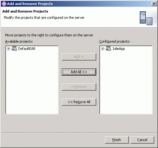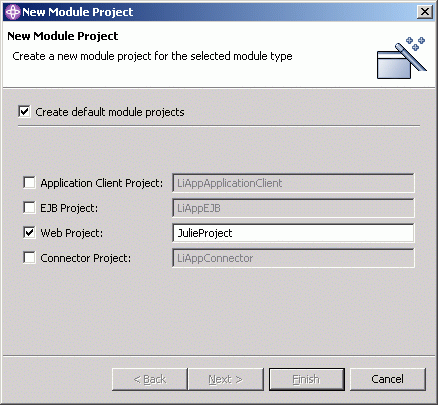 Since we do not want to use DefaultEAR, create a J2EE / Enterprise Application Project (project.gif ); JulieApp. Choose default J2EE 1.3 Enterprise Application project in next screen. Only check Web Project check box (module.gif) , enter name JulieProject. Then select JulieProject module, press finish to complete the project creation (app.gif).