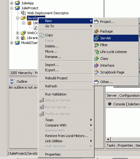 In WebSphere Studio Application Developer, switch to the Web perspective. Right click on JulieProject | JavaSource, select New | Servlet to create a servlet class JuliDataServlet. Use default to finish it. A file JuliDataServlet.java will be created and opened on the workplace.
