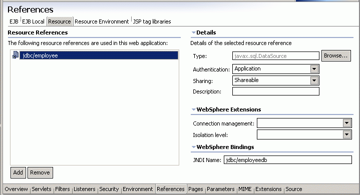 WebSphere Studio Application Developer makes this easy. In the Web perspective, expand the JulietProject and double-click the Web Deployment Descriptor (to open its editor), select the References tab at the bottom of this editor, and then select the Resource tab at the top. Click Add, define the name you are using (jdbc/employee), and specify javax.sql.DataSource as the type of object. Specify that the application will do the authentication. Now, as a developer, you happen to know that the deployer will use a different name, so specify jdbc/employeedb as the JNDI name for the WebSphere Binding for this resource. This is done so that your unit test will exercise the mapping of a local name to a global name. At this point, the editor looks like webxml.gif.